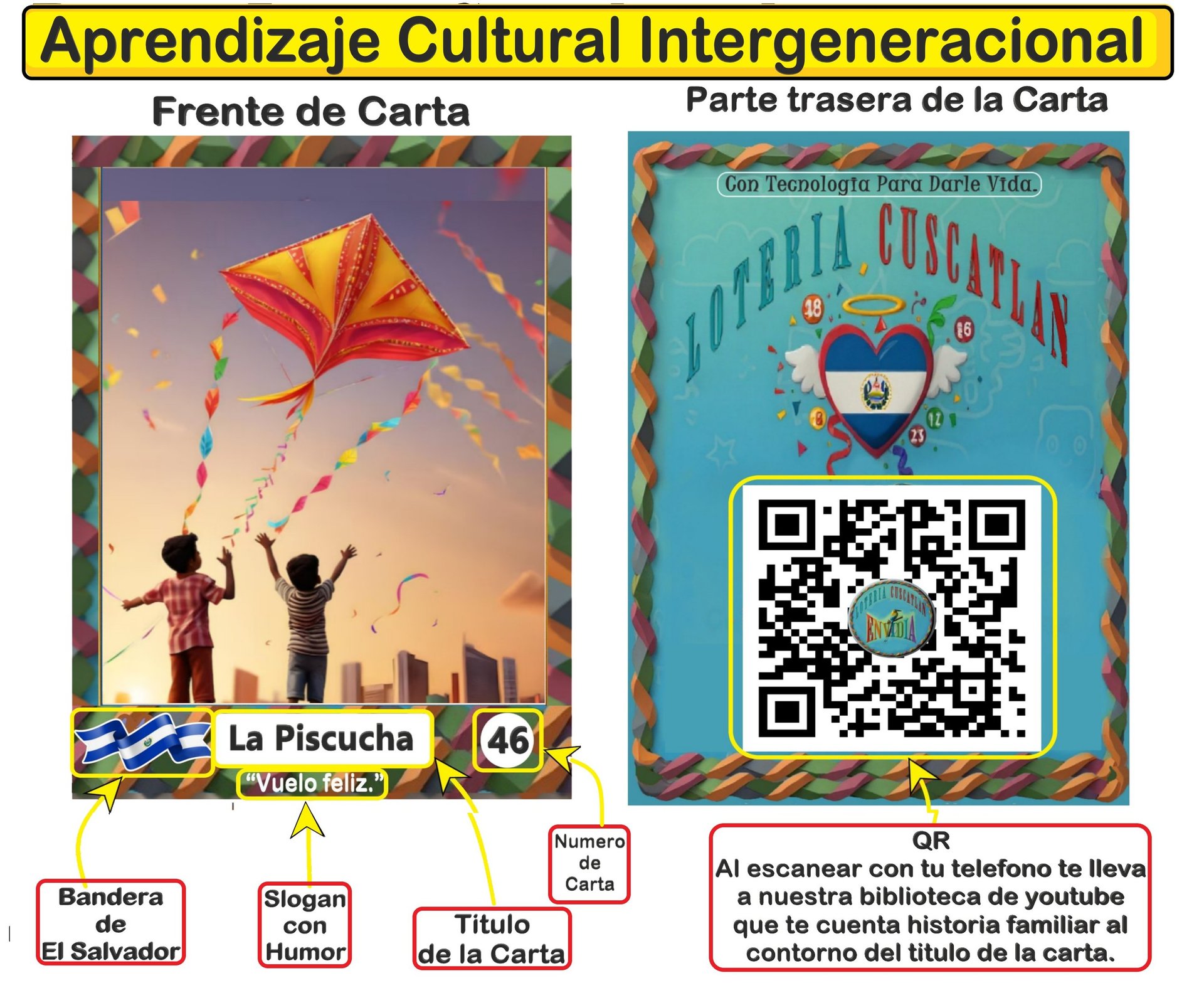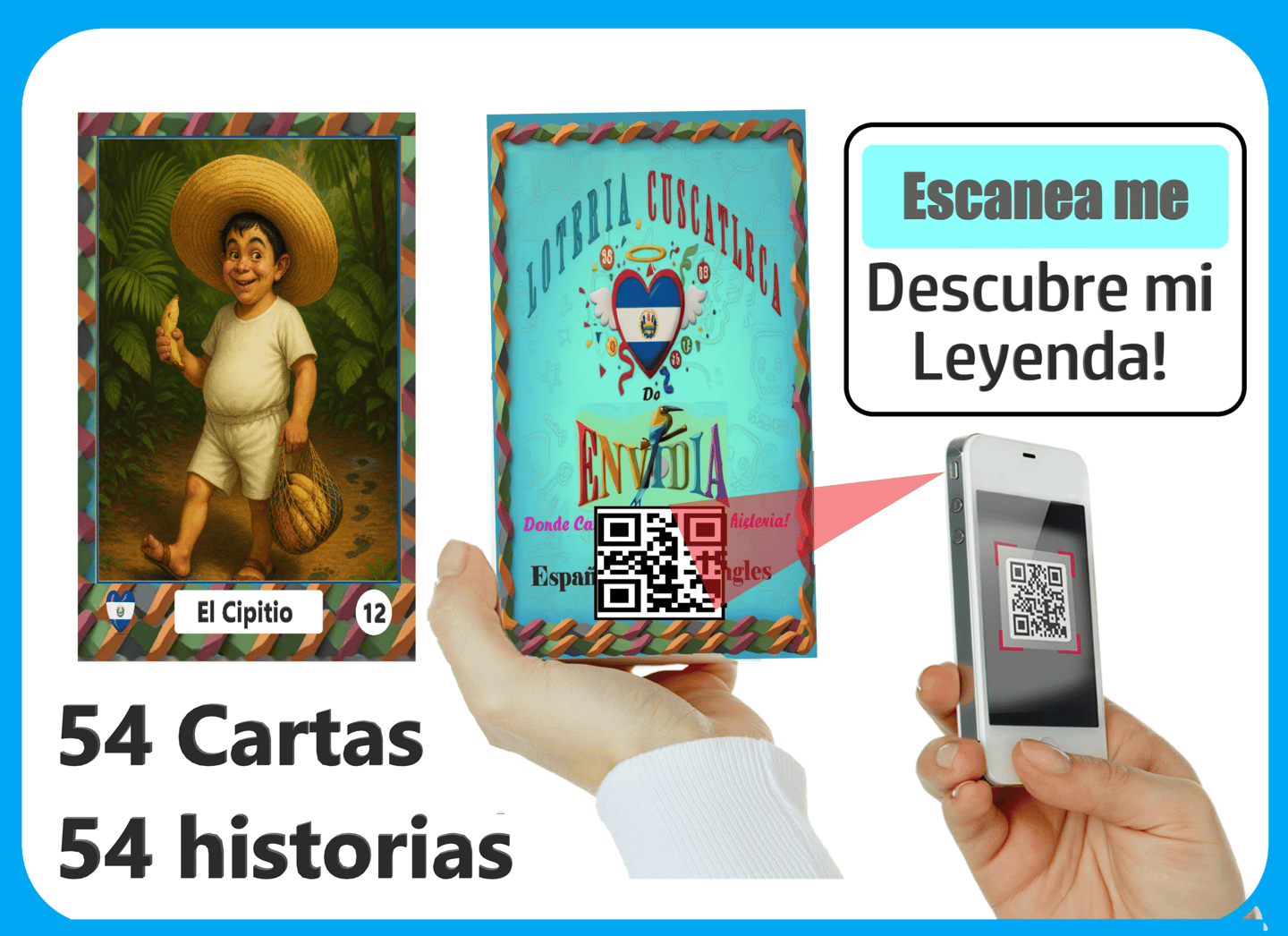 54 cartas con 54 historias. 10 Tableros Para 10Jugadores. ¡viene con un código QR en la parte trasera! Escanéalo y descubre la historia, atravez de video Familiar. Cada Carta es una obra de arte inspirada en personajes, costumbres y leyendas de El Salvador.