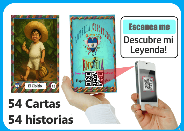 54 cartas con 54 historias. 10 Tableros Para 10Jugadores. ¡viene con un código QR en la parte trasera! Escanéalo y descubre la historia, atravez de video Familiar. Cada Carta es una obra de arte inspirada en personajes, costumbres y leyendas de El Salvador.