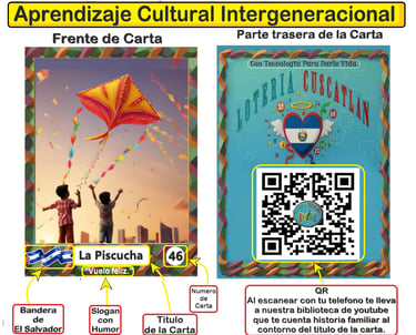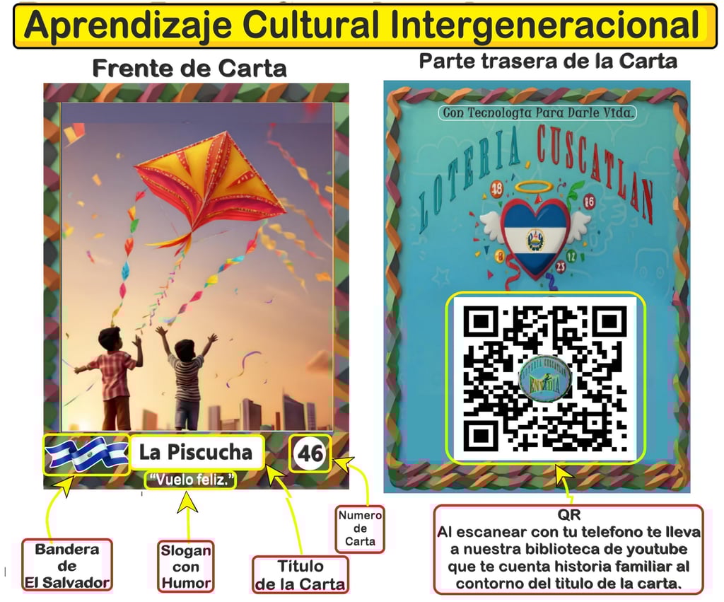 54 cartas con 54 historias. ¡viene con un código QR en la parte trasera! Escanéalo y descubre la historia, atravez de video Familiar. Cada Carta es una obra de arte inspirada en personajes, costumbres y leyendas de El Salvador. 10 Tableros 10 Jugadores.